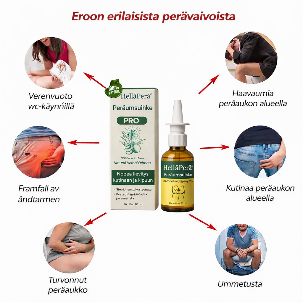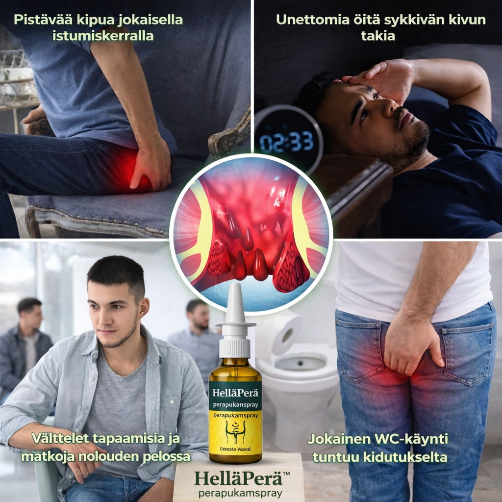 Peräpukamat voivat tehdä istumisesta kivuliasta, häiritä unta ja kuormittaa mieltä arjessa. Monille kyseessä on vaiva, joka palaa yhä uudelleen. HelläPerä™ – rauhoittava peräpukamien hoitosuihke on kehitetty tuomaan nopeaa ja hellävaraista helpotusta suoraan sinne, missä epämukavuus tuntuu – jotta voit jälleen tuntea olosi rauhalliseksi ja mukavaksi.