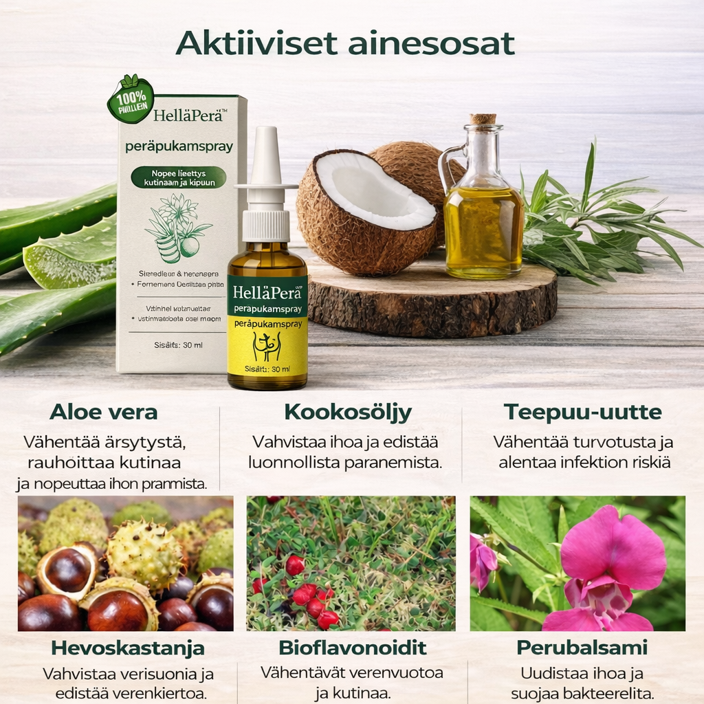 HelläPerä™ on kehitetty huolellisesti koostetulla luonnollisten yrttiuutteiden yhdistelmällä, jotka toimivat yhdessä tarjotakseen nopeaa ja kohdennettua helpotusta. Suihke on suunniteltu saavuttamaan alue tehokkaasti ja tuomaan mukavuutta sinne, mihin tavalliset voiteet eivät usein yllä.
